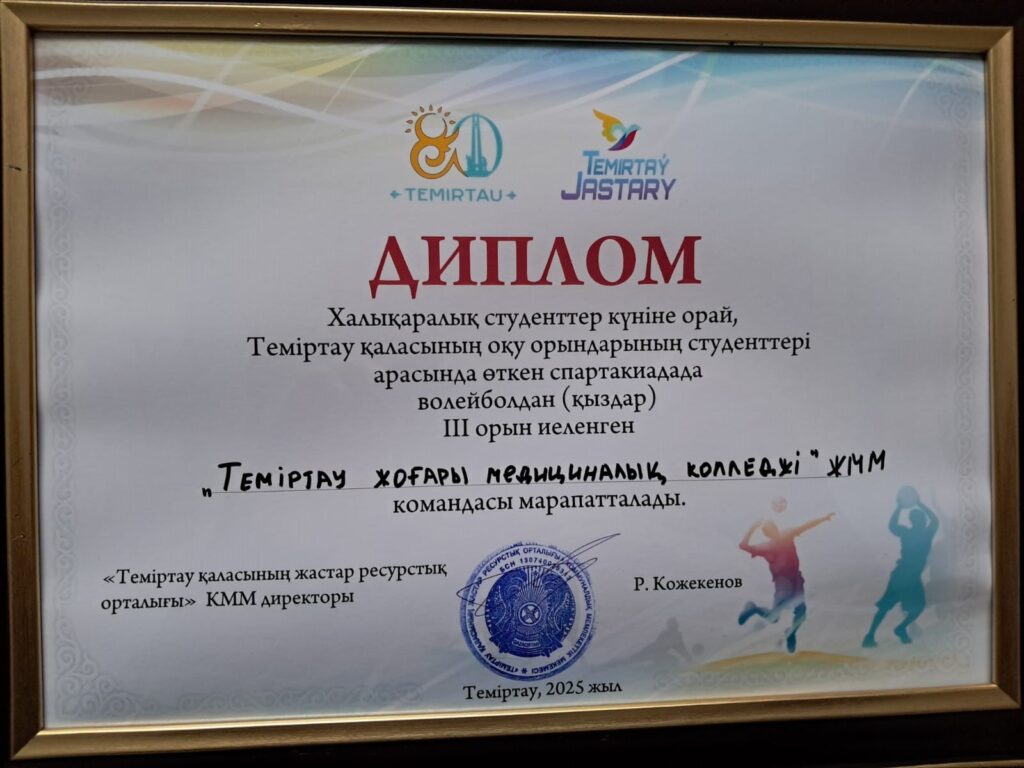 20 ноября состоялась городская спартакиада среди студентов колледжей в рамках социальной программы Жаркын белес. Программа спартакиады состояла из шести видов спорта. Женская волейбольная команда ЧУ ТВМК в упорной борьбе завоевала почётное третье место. Поздравляем наших девушек,желаем дальнейших успехов в учебе и спорте!!!