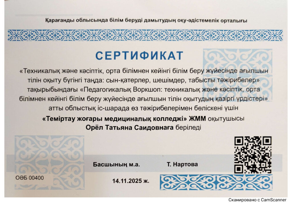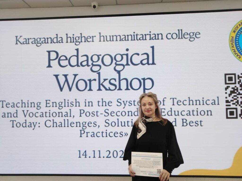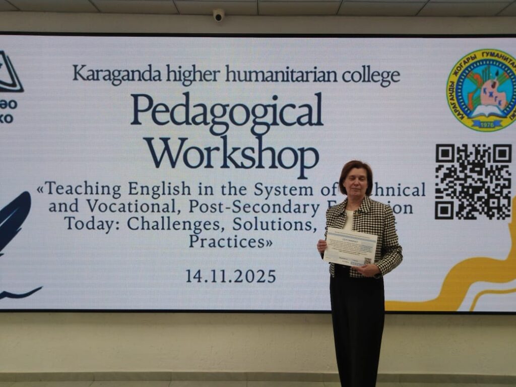 14 ноября 2025 года преподаватели ЧУ «Темиртауский высший медицинский колледж» Орел Т.С., Медведева Т.Ю. приняли участие в областном мероприятии «Педагогический Воркшоп: современные тенденции преподавания английского языка в системетехнического и профессионального, послесреднего образовния» по теме «Преподавание английского языка в системе технического и профессионального, послесреднего образовния сегодня: вызовы, решения, успешные практики», организованное КГКП «Учебно-методический центр развития образования Карагандинской области» в рамках работы областного методического объединения преподавателей иностранных языков.